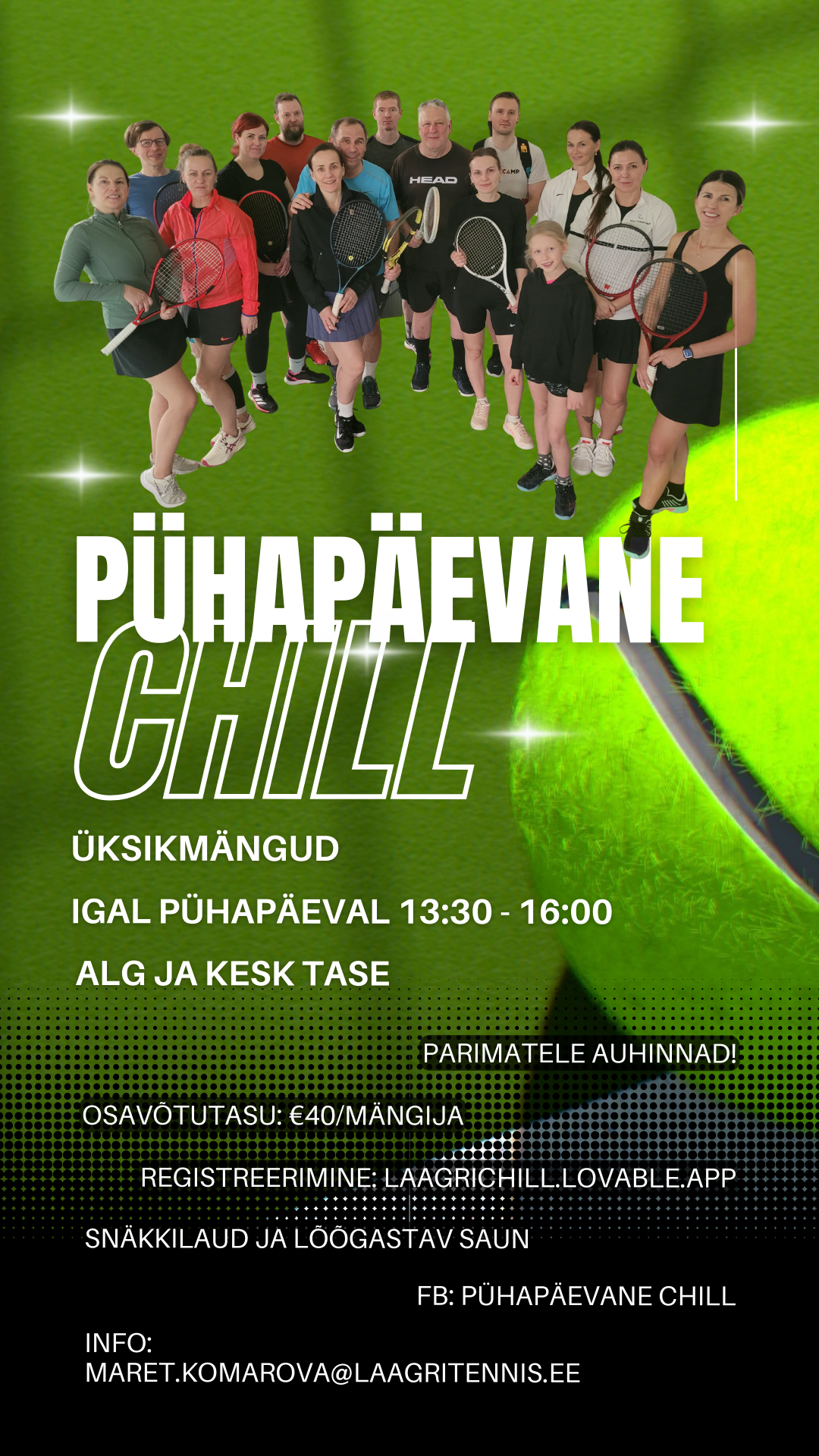 Pühapäevane Chill on iganädalane tenniseturniir alg- ja kesktasemel mängijatele, kus kohtuvad hea seltskond, sportlik hasart ja mõnus chill õhkond.
